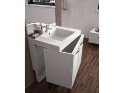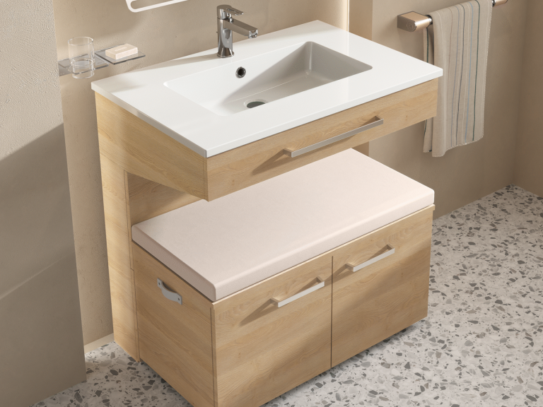 Si pour une raison ou pour une autre, vous avez besoin de vous asseoir pendant votre toilette au lavabo, le meuble situé en dessous de la vasque s'enlève sans travaux. Vous pouvez ainsi venir vous asseoir face à la vasque et au miroir pour un confort optimal.